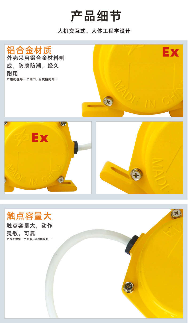 防爆跑偏開關(guān)用于常規(guī)皮帶輸送機:地下、索道支撐皮帶輸送機:輪船裝卸系統(tǒng);堆垛/取料輸送機;傾斜和梭式輸送機;起重機、挖掘機,起重臂限位:裙邊給料機/輸送機:重型極限開關(guān)檢測膠帶的跑偏量,是實現(xiàn)膠帶機控制的自動警示和停機的保護裝置。廣泛用于冶金、煤炭、水泥建材、采礦、電力、港埠、冶金、化工等領(lǐng)域的各種帶式輸送設(shè)備。