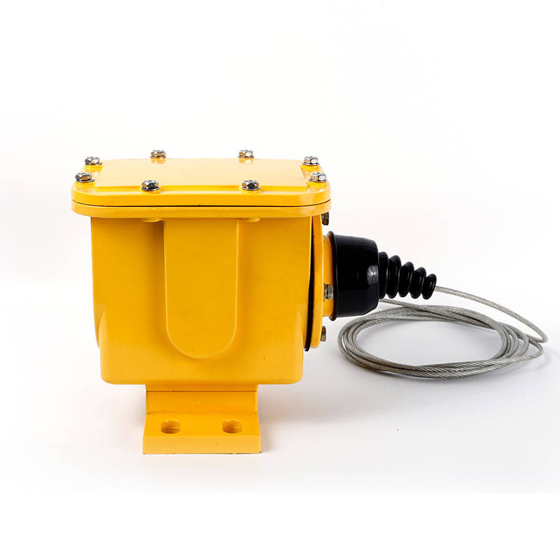 在皮帶出現(xiàn)撕裂、戳破、絞結(jié)處損壞或者鋒利物突出皮帶時(shí),撕裂開關(guān)能給監(jiān)視人員提供報(bào)警信號(hào)或關(guān)掉輸送機(jī)。撕裂開關(guān)應(yīng)該成對(duì)安裝在機(jī)頭、機(jī)尾及有溜槽下料口附近的皮帶兩側(cè),由兩段鋼絲繩連接。繩的一端固定在支撐架上,另一端連接在撕裂開關(guān)的搖臂上。兩段鋼絲繩在皮帶下方形成一個(gè)閉合回路,當(dāng)有物體或撕裂的皮帶懸下來掃到一條或兩條鋼絲繩時(shí),拉動(dòng)撕裂開關(guān)搖臂,使開關(guān)動(dòng)作發(fā)出報(bào)警或停機(jī)信號(hào),處理完故障之后,開關(guān)自動(dòng)復(fù)位。