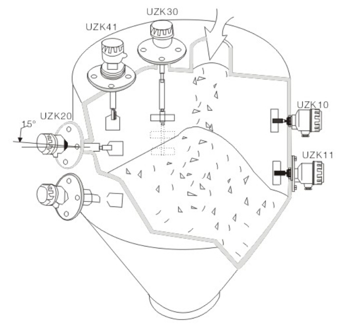 3. 測(cè)量粘度較大的粉體時(shí),應(yīng)從容器的上部向下垂直安裝或從側(cè)壁部斜向插入安裝。